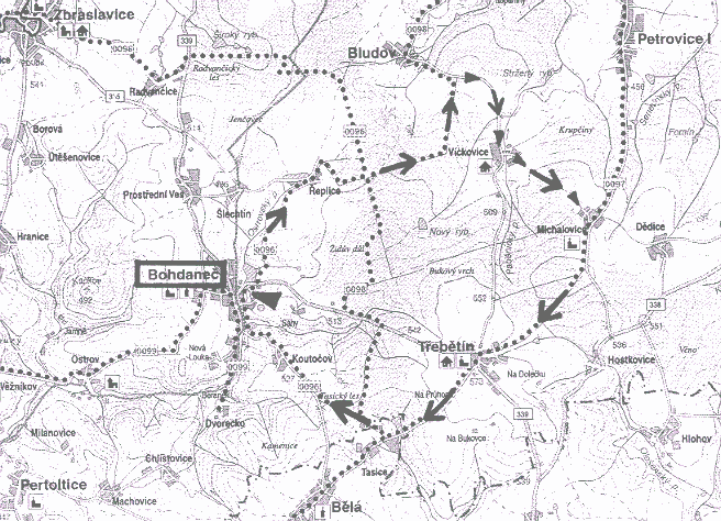 Cyklorasa 16 km: Od startu po vlastním značení kolem palírny po cyklotrase č.0096 přes Řeplice (1,5km) na křižovatku tras v lese (2,9km). Odtud rovně po trase č.0098 až na silnici. Tam doprava po vlastním značení do Vickovic (6,4km) a před kapličkou doleva po polní cestě do Michalovic, kde se dáme doprava mezi ploty, rovně kolem kostela (7,9km kontrola 7:30-13:30) a na silnici doprava. Zde již jedete po trase 0097 přes Třebětín (10,6km kontrola 7:45-14:00) do Tasic (12,4km). Odtud doprava na polní cestu po trase 0096 přes Kotoučov (14,2km) do cíle.