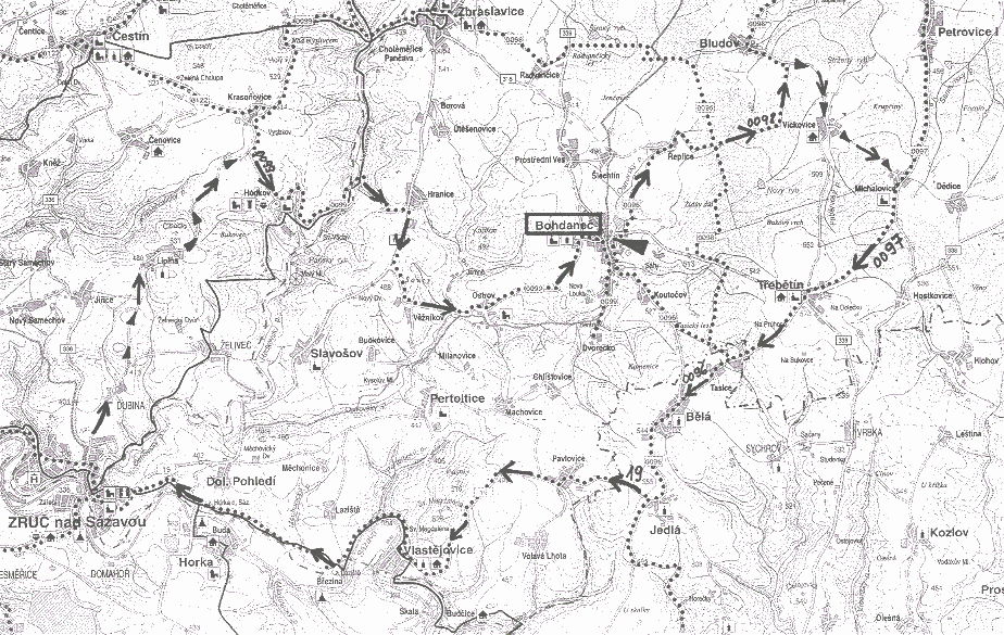 Cyklorasa 47 km: Od startu po vlastním značení kolem palírny po cyklotrase č.0096 přes Řeplice (1,5km) na křižovatku tras v lese (2,9km). Odtud rovně po trase č.0098 až na silnici. Tam doprava po vlastním značení do Vickovic (6,4km) a před kapličkou doleva po polní cestě do Michalovic, kde se dáme doprava mezi ploty, rovně kolem kostela (7,9km kontrola 7:30-13:30) a na silnici doprava. Zde již jedete po trase 0097 přes Třebětín (10,6km kontrola 7:45-14:00) do Tasic (12,4km). Odtud rovně po trase 0096 přes Bělou do Jedlé(15,7km). Dále doprava! po Posázavské trase č.19 přes Pavlovice, Vlastějovice (21,5km), Březinu do Zruče nad Sázavou (28km). Dále po vlastním značení. Zručí projedeme po hlavní silnici, až na konci Zruče pokračujeme rovně po vedlejší silnici směr Zbraslavice. Přes Dubinu do Lipiny. Tam u zrcadla doleva. Asi 2km za Lipinou doprava směr Hranice. Nyní už jedeme po trase 0099 přes Hodkov (37,4km), konec Hranic, Věžníkov (42,7km) a Ostrov do Bohdanče.