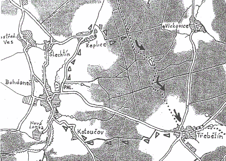 Trasa 10km: Od startu po vlastním značení po asfaltové cestě kolem palírny až do Řeplic (1,5km). V Řeplicích doprava a podél rybníka. Asi 50 metrů za Řeplicemi odbočíme doprava po cestě kolem samostatně stojící usedlosti (s koňmi v ohradě) k lesu. V lese na křižovatce cest odbočíme doprava po žluté značce (2,9km), která po chvíli odbočuje doleva a kolem Nového rybníka (3,9km) pokračuje až do Třebětína (6km-kontrola u kostela). Odtud po vlastním zn. po silnici na Bohdaneč. U křížku odbočíme doleva na polní cestu a po ní až do lesa. Od zatáčky u posedu jdeme stále rovně lesem, po louce podél dalšího posedu na silnici nad Kotoučovem. Na ní doprava přes Kotoučov do Bohdanče. U kostela doprava do cíle.
