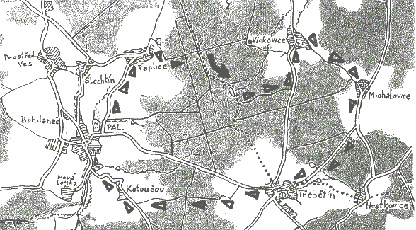 Trasa 15 km: Od startu po vlastním značení po asfaltové cestě kolem palírny až do Řeplic (1,5km). V Řeplicích doprava a podél rybníka. Asi 50 metrů za Řeplicemi odbočíme doprava po cestě kolem samostatně stojící usedlosti (s koňmi v ohradě) k lesu. V lese na křižovatce cest odbočíme doprava po žluté značce (2,9km), která po chvíli odbočuje doleva a kolem Nového rybníka (3,9km). Asi 100m za ním odbočíme doleva po vlastním zn. až na silnici. Po ní jdeme doleva do Víckovic. Tam za kapličkou odbočíme doprava na cestu, která vede téměř rovně do Michalovic. Brzy po začátku Michalovic odbočíme doprava mezi ploty ke kostelu (7,7km-kontrola) a pokračujeme rovně a u STOPky doprava po silnici. Asi po půl km na křižovatce doprava až do Třebětína (10,3km-kontrola u kostela). Odtud po silnici na Bohdaneč. U křížku odbočíme doleva na polní cestu a po ní až do lesa. Od zatáčky u posedu jdeme stále rovně lesem, po louce podél dalšího posedu na silnici nad Kotoučovem. Na ní doprava přes Kotoučov do Bohdanče. U kostela doprava do cíle.