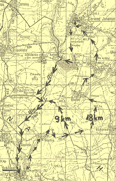 Cyklotrasa 18 km: Od startu po cyklotrase č. 0096 přes Řeplice na rozcestí v lese odkud pokračujeme rovně po trase č. 0098 až do Červených Janovic -kontrola u kostela 8:00-16:00 (9,5km). Odtud po vlastním značení po cestě kolem rybníku Pohan a před Katlovem doprava kolem chat. Za tenisovými kurty doleva po zelené turistické značce. Až značka odbočí, pokračujeme rovně po vlastním značení a žluté tur. značce na rozcestí „U mohyly“. Odtud opět doprava po zelené, před Šlechtínem kousek po vlastním značení a opět po zelené přes Šlechtín do Bohdanče a po hlavní silnici